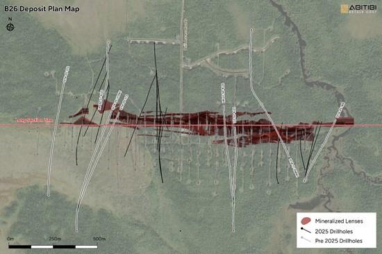 Louis Gariépy, P.Geo., Vice President Exploration of Abitibi Metals, commented: “Geologically, these results reinforce our understanding that B26 hosts a robust, multi-phase mineralized system. The 150-metre step-out confirms that the Western Copper-Gold Zone maintains strong grades at depth and along plunge, while new drilling into the VMS horizon continues to extend zinc-silver mineralization well beyond the existing resource model. The discovery of copper-gold mineralization 300 metres west of the block model, within the same alteration signature as the main deposit, suggests the system remains open laterally to the west and at depth. Every metre drilled is adding confidence and scale to what is shaping up to be a large mineralized footprint.”
