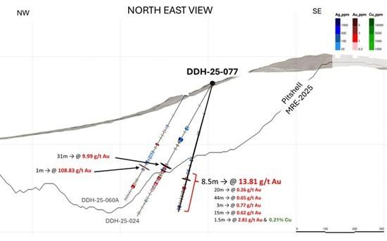 Additional assay results from nearby holes are pending, with drilling ongoing to further define the continuity and extent of this expanding high-grade gold zone within the larger mineralized system.