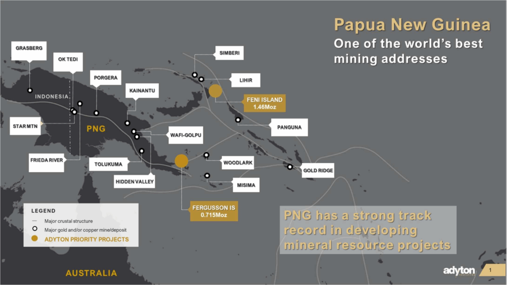 The Feni Island Project currently has a mineral resource prepared in accordance with NI 43-101 dated October 14, 2021, which has outlined an initial inferred mineral resource of 60.4 million tonnes at an average grade of 0.75 g/t Au, for contained gold of 1,460,000 ounces, assuming a cut-off grade of 0.5 g/t Au. See the NI 43-101 technical report entitled “NI 43-101 Technical Report on the Feni Gold-Copper Property, New Ireland Province, Papua New Guinea prepared for Adyton Resources by Mark Berry (MAIG), Simon Tear (MIGI PGeo), Matthew White (MAIG) and Andy Thomas (MAIG), each an independent mining consultant and “qualified person” as defined in NI 43-101,available under Adyton’s profile on SEDAR+ at www.sedarplus.ca. Mineral resources are not mineral reserves and have not demonstrated economic viability.