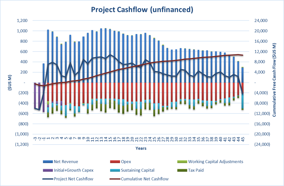 The PEA envisions a combination of open-pit and underground mining, followed by processing via a conventional copper flotation circuit having a nameplate processing capacity of 60,000 tonnes per day. This results in a mine life of 48 years with an average annual production of 102,742 CuEq tonnes for LOM, 116,539 tonnes CuEq for the first 30 years, and 121,748 CuEq tonnes for the first 20 years. Table 1 presents key operating and financial highlights from the PEA, using base study case assumptions of $4.35/lb Cu, $2,500/oz Au and $27/oz Ag. Figure 1 displays annual CuEq production for the LOM, while Figure 2 displays projected cash flows.
