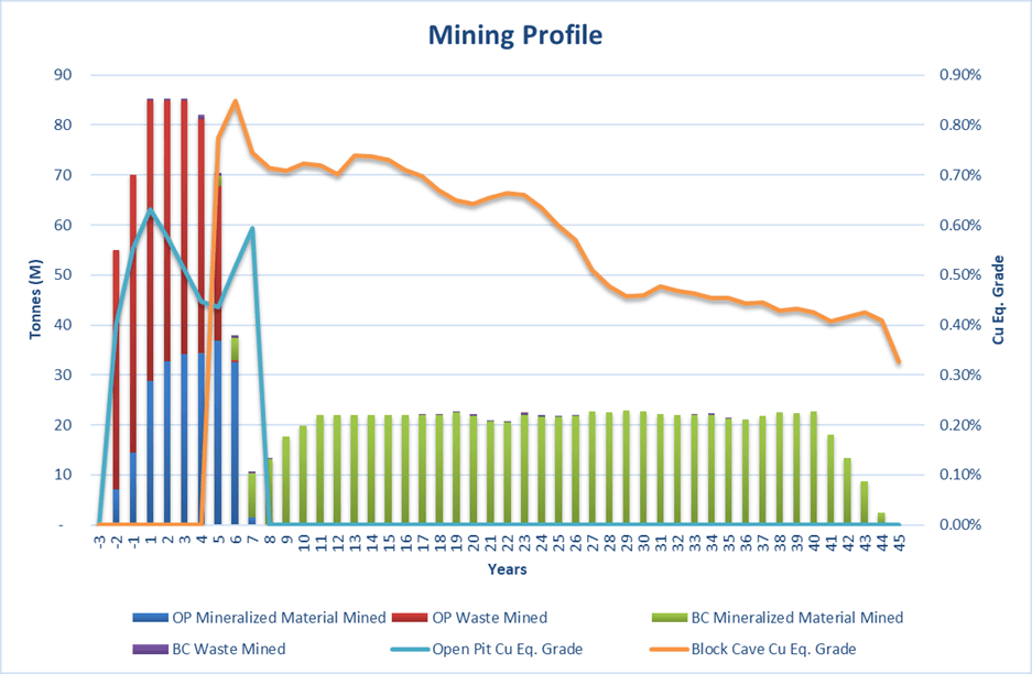 The proposed mining method is divided into open-pit mining for the near-surface part of the deposit and underground caving for the deeper parts. The open pit will use well-known truck and shovel operations with 12.5-m bench intervals. Haul trucks will be used for hauling mineralized material to the crushing plant and long-term stockpile facilities. Waste rock will be hauled to the closest waste rock storage facility. Underground operations will handle material in bulk using well established block caving methods. Open-pit mining will occur during the first 9 years of operation (in the Altar Central area), while underground development is underway. The mining profile for the project can be seen in Figure 3.