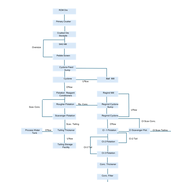 Extensive metallurgical test work has demonstrated that the contained copper and gold can be effectively recovered in a traditional flotation concentrator that would produce a single gold-bearing copper concentrate using industry-accepted technologies. The flowsheet includes primary crushing followed by grinding in a SAG (semi-autogenous grinding) mill/ball mill grinding circuit, rougher flotation, regrinding of the rougher concentrate and three stages of cleaner flotation. The concentrator would be constructed with a capacity to process 60,000 tpd and operated on a 365 day/year, 24 hour/day schedule. A simplified process flowsheet can be seen in Figure 4. LOM average recoveries for Cu, Au and Ag are 87.76%, 57% and 50% respectively. The grade of the concentrate produced is 26% for the LOM. Arsenic in the concentrate is expected to range from 0.5% to 2.2%. Aldebaran hired the CRU Group, a global leader in commodity research and market analysis, to complete a study analyzing the placement of arsenic-bearing concentrates into the marketplace, which showed that blending capacity for arsenic-bearing copper concentrates worldwide has increased materially in recent years, and penalties paid for arsenic-bearing concentrates have decreased substantially. The PEA utilizes CRU’s view on arsenic penalties.