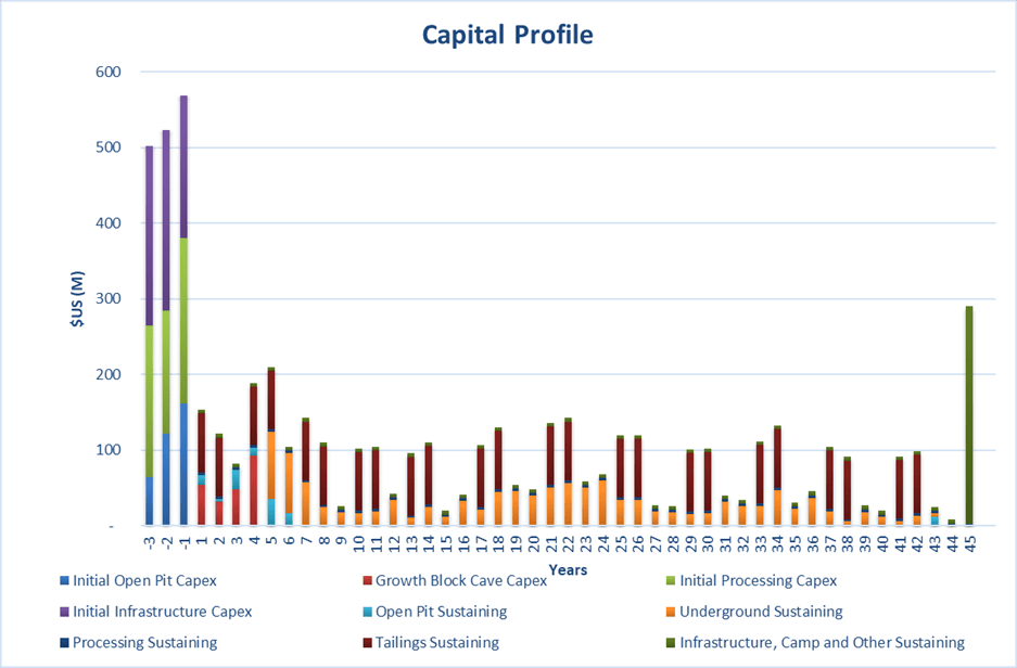 The capital cost estimate prepared for the PEA includes an installation cost associated with the site infrastructure, open pit mine and concentrator plant, a growth capital associated with the installation of the block caving underground mining operation, and the sustaining capital associated with the production plan. The LOM summary of capital is presented in Table 3, while the capital profile for the LOM is presented in Figure 5.