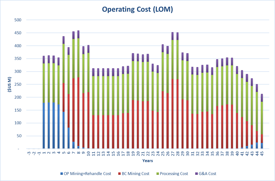 Operating costs were estimated for the open pit mining operation, block caving mining operation, the concentrator processing operation, and G&A. A summary of the estimated operating costs is presented in Table 4. The buildup of LOM C1 cash costs and AISC can be found in Tables 5 and 6, while operating costs by year can be found in Figure 6.