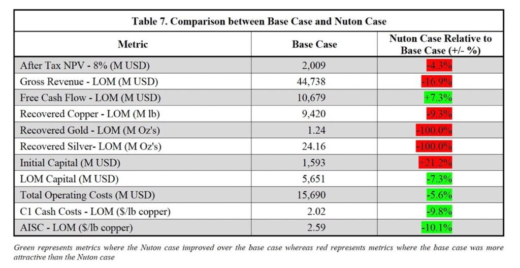 To demonstrate the Nuton Case, the variance percentage relative to the Base Case is included here for selected key production and financial metrics. The results of the Nuton Case can be found in Table 7. Measurable contributors to capital spend include a Tailings Storage Facility (TSF) for the Base Case and a Heap Leach Pad (HLP) for the Nuton Case. The Nuton case shows higher initial capital requirements due to the need for more infrastructure from the start-up (e.g. full-sized ponds) compared to a TSF. However, LOM capex in the Nuton Case is lower, as TSF requires higher sustaining capex to reach final capacity. Additionally, at this time, precious metals such as gold and silver cannot be recovered with Nuton® Technology, whereas they are recovered in the Base Case. Timing of capital and revenue from copper equivalent reduces the NPV for the Nuton Case, but lower total capital and lower operating C1 and AISC costs allow for a higher Free Cash Flow in the Nuton Case.