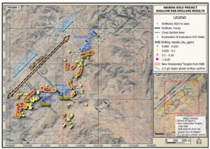 Figure 2 shows the location of ABR179 with the other completed drillholes, the approximate 0.2 g/t gold contour outline of the drilled prospects to date, and the newly identified shallow RAB targets. The Figure 2 map also shows that only some 20%, or collectively 1.5km, of the overall 7km long Aburna Project Gold trend has been tested by drilling. The Company anticipates based upon the team’s experience at Aburna that further prospects will develop with future exploration and drilling along this trend.