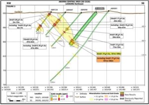 ABR185 targeted an area of potential extension to the Northeast prospect. It importantly returned multiple zones of relatively low tenor gold mineralization; 6m @ 0.28 g/t from 30m, 1m @ 1.65 g/t from 65m, 5m @ 0.27 g/t from 99m, and 2m @ 0.66 g/t gold from 132m. The Company believes these results could lead to a refined structural target for higher grade and expansion of the gold mineralization near this area of the Northeast prospect. The location of all the newly reported drillholes are also indicated on Figure 2. Table 1 provides full summary of the selected intersections and Table 2 presents details of all the drillholes completed to date with IDs, azimuth, dip, end of hole depths, collar coordinates and comments.