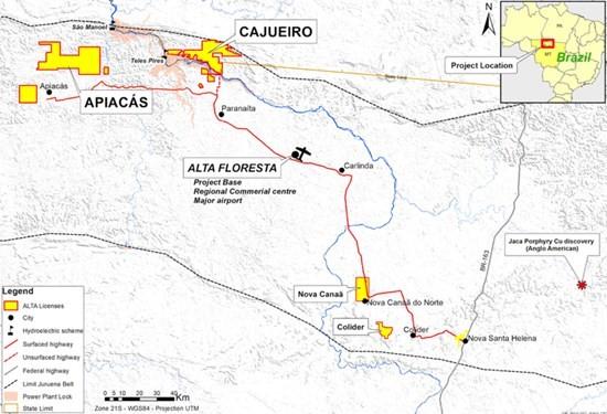 The Cajueiro district is located approximately 75km NW of the town of Alta Floresta in the state of Mato Grosso (Figure 1) in central western Brazil. The project is easily accessible by road, lies on open farmland and has grid power and a local water supply. Cajueiro is the most advanced of the key projects that Altamira controls in the region (Figure1).