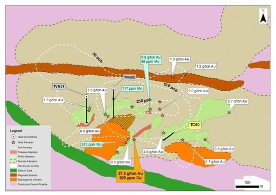 Hole TVN001 was drilled 100m to the west of TVN002 and intersected narrow intervals of low-grade mineralization including 3.3m @ 0.30 g/t gold from 11.0m depth and 1.0m @ 0.40 g/t gold from 61.0m depth. The hole cut wide intervals of quartz porphyry and magnetic breccia containing pyrite, galena, molybdenite, and sphalerite. This hole was collared to the west of the main gold-in-soil anomaly for logistical reasons at the time of drilling (Figure 3) and therefore did not intersect the main mineralized zone, which is interpreted as extending eastwards where further drilling is planned.