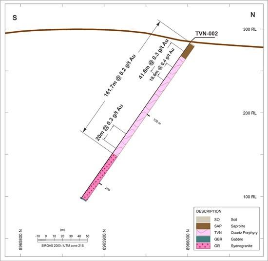 Hole TVN002 was sited at the western end of the higher-grade section of the soil anomaly and was completed to a depth of 227m metres. The hole intersected 161.7 metres of quartz porphyry with quartz veining and abundant pyrite and magnetite, associated with potassic and phyllic alteration. The entire quartz porphyry interval, including zones of brecciated intrusive, returned 161.7m @ 0.2g/t gold (Figure 4).