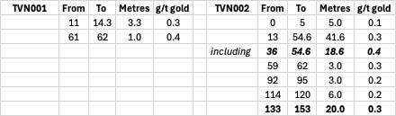 Table 1: Main assay results for drill holes TVN001 and TVN002. All mineralization is hosted within altered quartz porphyry.
