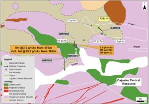 CEO Mike Bennett commented; “The discovery of higher-grade gold in a new and previously unrecognized porphyritic intrusive body at Morro Verde significantly extends the corridor of interest that runs east from the Maria Bonita porphyry. Following the recent discovery of gold mineralization at Tavares Norte, we now have drill intercepts in two separate gold-mineralized porphyry intrusives over an east-west distance of 6.5km from the Maria Bonita mineral resource. Scout drilling has now intersected mineralized intrusives at the first two of our eight district targets. The grade in the Morro Verde intercept is particularly encouraging as it confirms the potential to find mineralization with a combination of grades and widths that could have economic potential for both open-pit and underground mining operations With two rigs on site, we will continue follow-up drilling of these two new discoveries while also advancing expansion drilling of the two mineral resources at Maria Bonita and Central gold deposits.”
