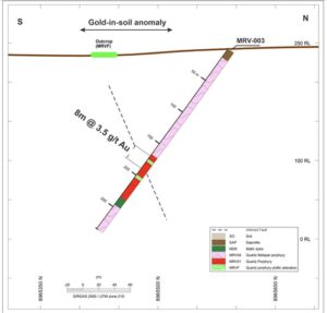 Figure 4: Cross section for drill hole MRV003. The mineralized interval correlates with altered intrusive rocks on surface within a gold-in-soil anomaly.