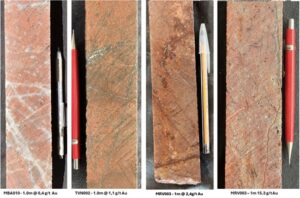 Holes MRV001 and 002 targeted a separate surface grab rock sample+ anomaly in altered intrusive rocks (Figure 3). Hole MRV001was drilled entirely within a later sterile gabbro dyke that has no surface expression and returned no gold values. Hole MRV002 intersected 65m of quartz porphyry intrusive showing alteration but with little veining and no significant gold. The northern gold-in-soil anomaly with coincident phyllic alteration has been partially drill tested by a previous drill hole (CJO098) which intersected tuffs overlying altered intrusives. Further drill testing is pending on both of the gold-in-soil anomalies.