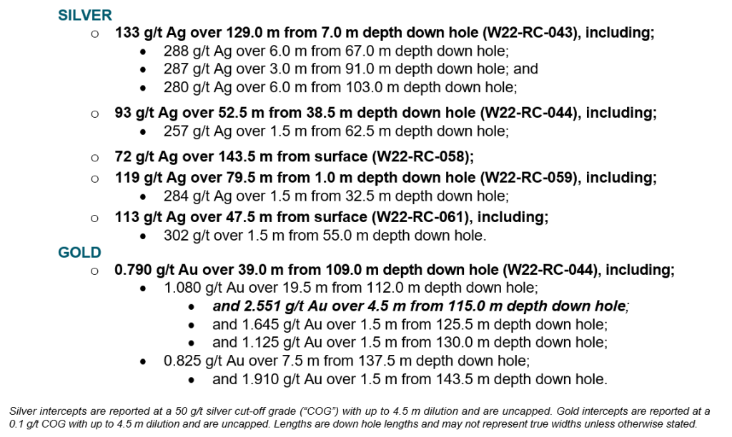 Figure 1: Locations of drill hole collars for results reported December 1, 2022, for Phase 2 of the Calico Project 2022 Drill Program. Figure 2: Assay results for drill holes W22-RC-043 and W22-RC-044 reported December 1, 2022, for Phase 2 of the Calico Project 2022 Drill Program. Figure 3: Assay results for drill holes W22-RC-058 and W22-RC-059 reported December 1, 2022, for Phase 2 of the Calico Project 2022 Drill Program.