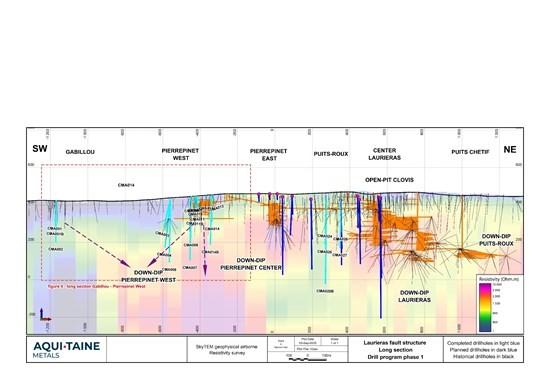 The current drilling program is focused on the Gabillou, Pierrepinet West, Pierrepinet East and Puits-Roux targets located along the Laurieras fault structure. Drilling began in February 2025 and will continue into the autumn. For most of the drill sites, two to three drill holes are aligned in a fan pattern targeting the same gold and critical metal bearing structures, veins, breccias and stockworks at varying depths. Figures 1 and 2 are plan maps of the program and Figures 3 and 4 are long sections of the program.