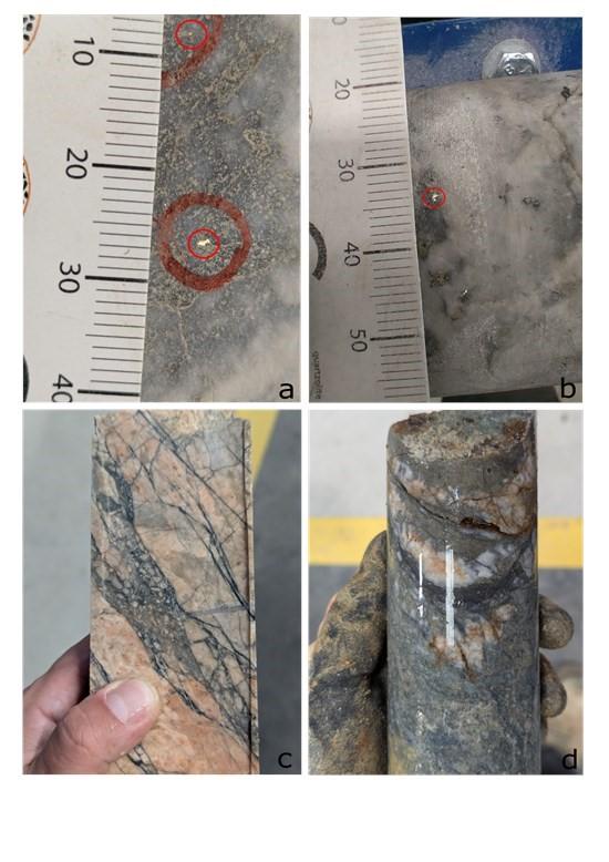Results strongly support the Company’s thesis that significant low-grade gold mineralized halos exist around the high-grade veins (Figure 5). Gold mineralization is mainly composed of coarse grains of visible gold and electrum (mm to cm), with accessory pyrite, arsenopyrite, galena, sphalerite, chalcopyrite, tetrahedrite and stibnite (Figure 6).