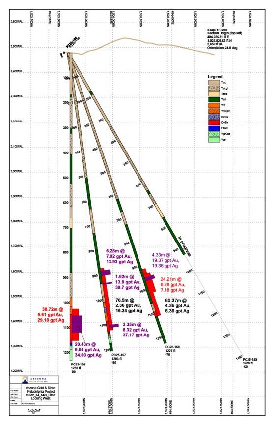 Arizona Gold & Silver Inc. (TSX-V: AZS) (OTCQB: AZASF) is pleased to announce it has received assays from the latest core hole, PC25-158 on the Philadelphia project in Arizona. This hole extends the wide zone of high-grade gold mineralization in the Perry Discovery 110 metres north from hole PC25-156. Drilling is continuing with PC25-159 stepping out a further 60m to the north.