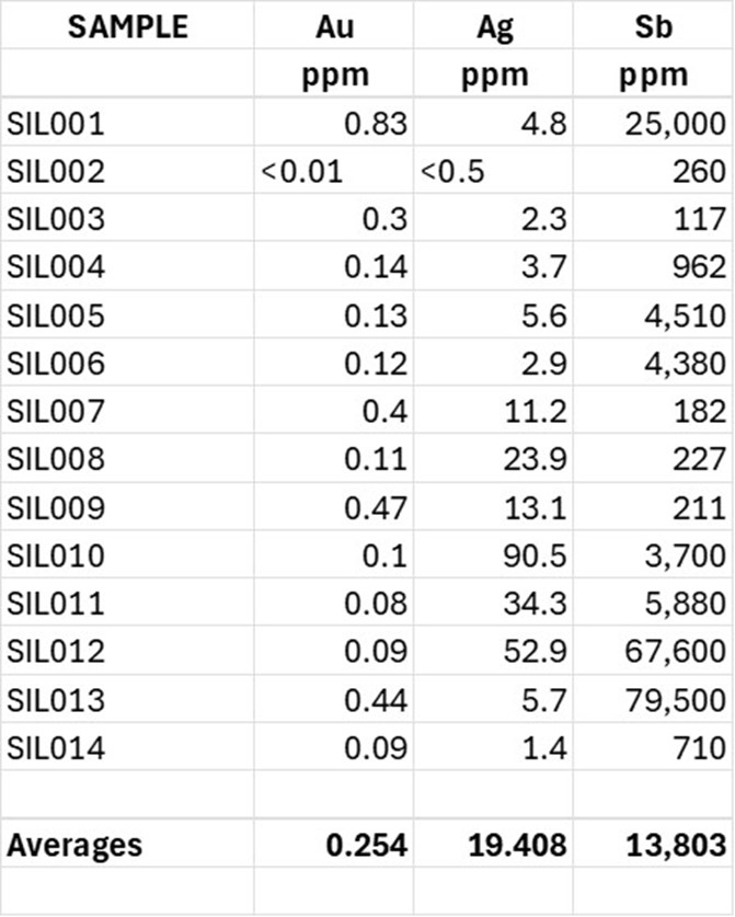 AZS collected 14 samples across stibnite-quartz veins and adjacent silicified and argillized ash flow tuff where previous sample tags could be found in the field. Sample lengths ranged from 7.5 to 61.0 centimeters across stibnite-bearing veins. The highest grade of 7.95% Sb came from a vein 25.4 centimeters wide. The average of all fourteen samples was 1.38% Sb, including non-vein material. The rock chip samples were taken across a strike length of 500 metres and a width of 300 metres. The results demonstrate the size of the antimony target present on the property. Sample preparation and analyses were done by ALS Global Labs. Sample preparation was done at their sample prep facility in Tucson, Arizona. MS-ICP analyses were done at their analytical facility in Vancouver, BC. Over-limits for antimony were done at their laboratory in Loughrea, Ireland. The individual results are tabulated below. The samples contain anomalous gold and silver along with anomalous to high-grade antimony. Gold was determined by fire assays with an AA finish. Silver was determined by ICP analyses.