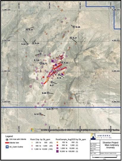 Arizona Gold & Silver Inc. (TSX-V: AZS) (OTCQB:AZASF) is pleased to announce high-grade antimony sampling results from the Silverton gold-antimony project located in Nye County, Nevada, immediately north of US Highway 6, between Tonopah and Ely. Silverton hosts two target types: a Carlin-type large tonnage gold system, and an overlying high-grade antimony+gold-silver veins that are well exposed at surface.