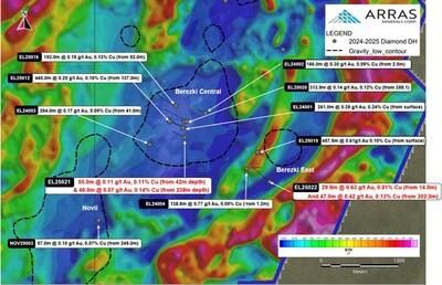 Tim Barry, CEO of Arras Minerals, commented: ” The Berezski North Target is firming up as a second bonafide, near-surface, copper-gold porphyry system which is also open in multiple directions. We are reviewing geophysics and drill data and are planning to increase our drilling focus here starting in February, particularly in the southerly and westerly direction. Hole EL25023 intersected very nice zones of copper-gold mineralization extending the footprint of the Berezski North mineralized envelope to approximately 600 metres and strongly suggests that the mineralization intersected in hole EL24005, EL25016 and EL25023 are part of the same system. We plan to continue stepping out to test for continuity of these high-grade, near-surface zones.” He went on to add, “Berezski Central, five kilometres south is another key porphyry system in the trend that continues to expand. Unfortunately, Hole EL25021 didn’t reach the targeted depth because of mechanical issues on the Drill Rig. We have additional assays pending from this target and following the successful KGK top of bedrock program announced last month, we have confirmed strike potential of at least one kilometre at Berezski Central that will be followed up when core drilling recommences next month.”