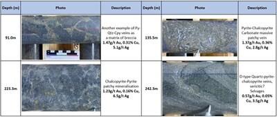 Notes: For copper and gold equivalent calculations the following metal process were used: US$3.75/lb. Copper, US$3,000/oz Gold, US$35/oz Silver, US$30/lb Molybdenum, and metallurgical recoveries have been updated to Cu 90%, Au 85%, Ag 75%, Mo 80%. All intervals are presented as core lengths as the true thicknesses of mineralization is currently unknown.