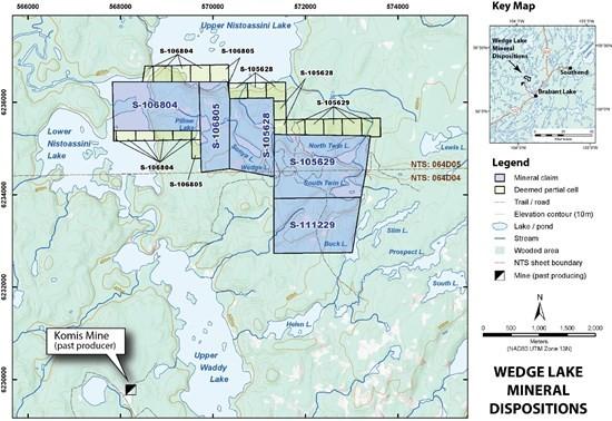 The Wedge Lake Project is situated approximately 165 km northeast of La Ronge, Saskatchewan (56° 15′ 10.557″ N, 103° 51′ 12.410″ W). Locally, the project is located along the southern shore of Upper Nistoassini Lake and approximately 2 km north-east of Upper Waddy Lake. The National Topographic System (NTS) map sheets of the claims are 64D04 and 64D05. The Company’s Wedge Lake Gold Project now totals 32,459 acres, including the newly staked claims.
