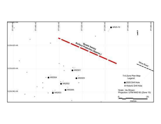 All holes completed to date at the T-6 Zone intersected quartz-vein-hosted mineralization with visible gold observed in all holes at T-6 except AR25-04. The table below lists the significant gold assays results obtained in each hole at T-6.