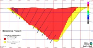 In order to establish reasonable prospects for economic extraction (RPEE) as per S-K 1300 definitions of Mineral Resources, SRK applied an economic cut-off grade (CoG) to blocks constrained within an economic pit shell on the Borborema property. This shell utilizes a 1.0 revenue factor, 37-degree slope on the west and 60-degree slope on the east, 2 million tonnes per annum (Mtpa) mining rate, and 5% discount rate. A long section of the resource pit shell is shown in figure below.