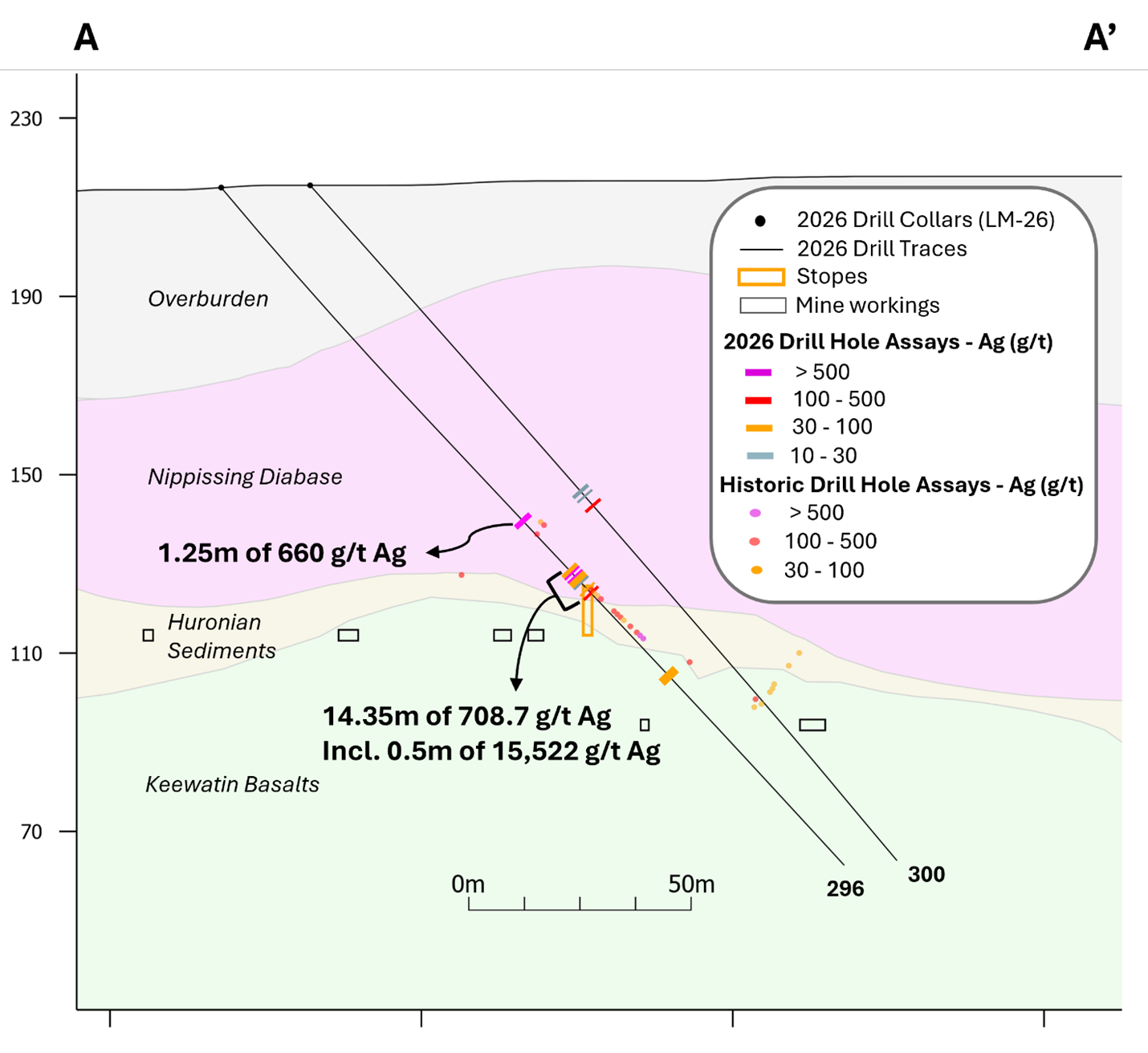 The initial drill holes for this season were positioned to evaluate silver mineralization south of the Shaft 6 area (Figures 1 & 2). Previous exploration campaigns in this region identified silver predominantly hosted within vertical, dilatant zones and shear veins, manifesting as native silver. Several holes reported in this release successfully intercepted silver mineralization (Table 1). Notably, holes LM-26-296 and LM-26-301 returned continuous silver mineralization over a 10‑plus‑metre interval, highlighted by localized very high‑grade zones (Figures 3 & 4).