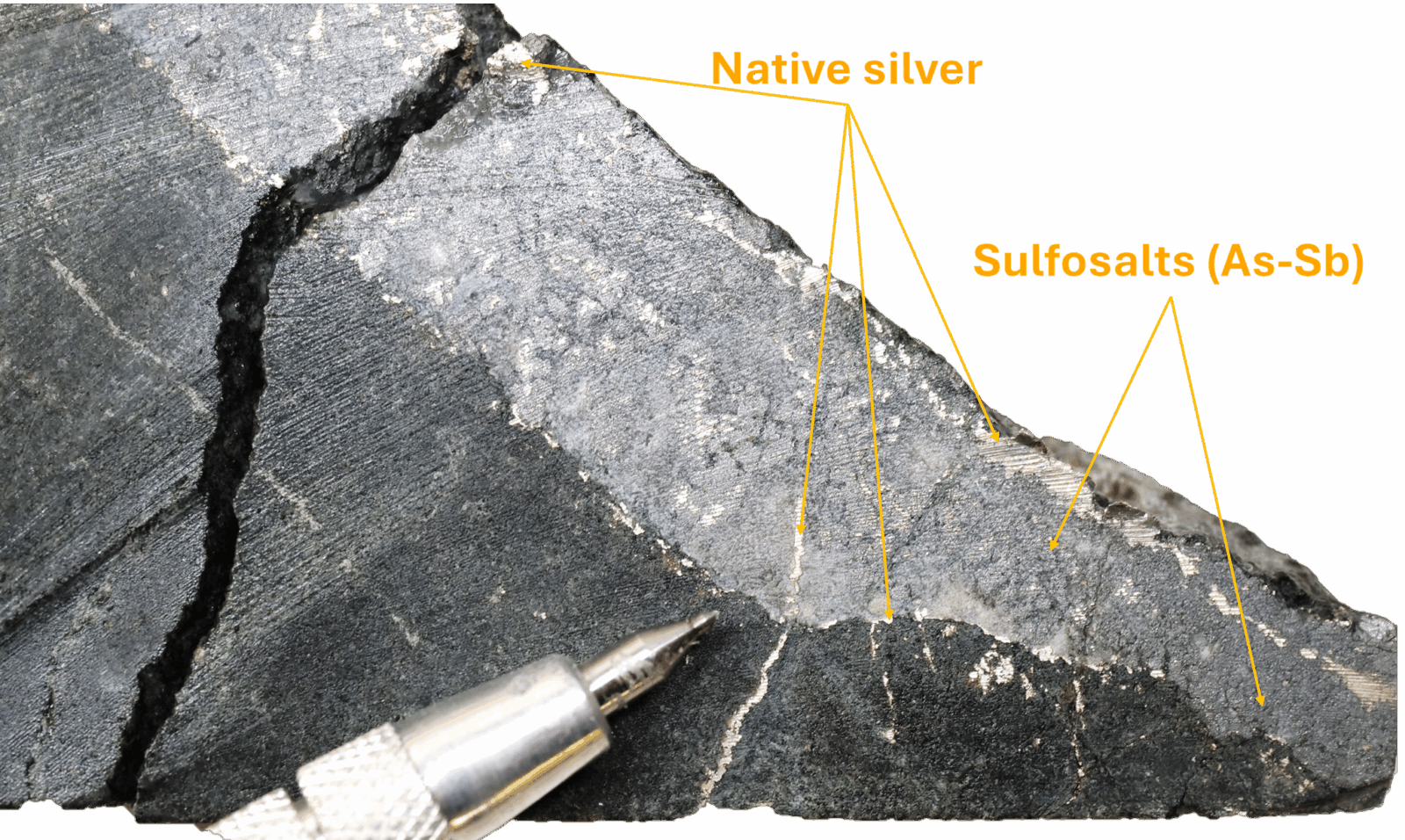 Figure 6. Photograph of NQ Core LM-26-301 at 115.65m, of native silver within carbonate veins.