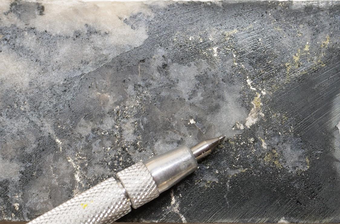 Figure 5. Photograph of NQ Core LM-26-296 at 118.6m, of native silver and sulfosalt vein.