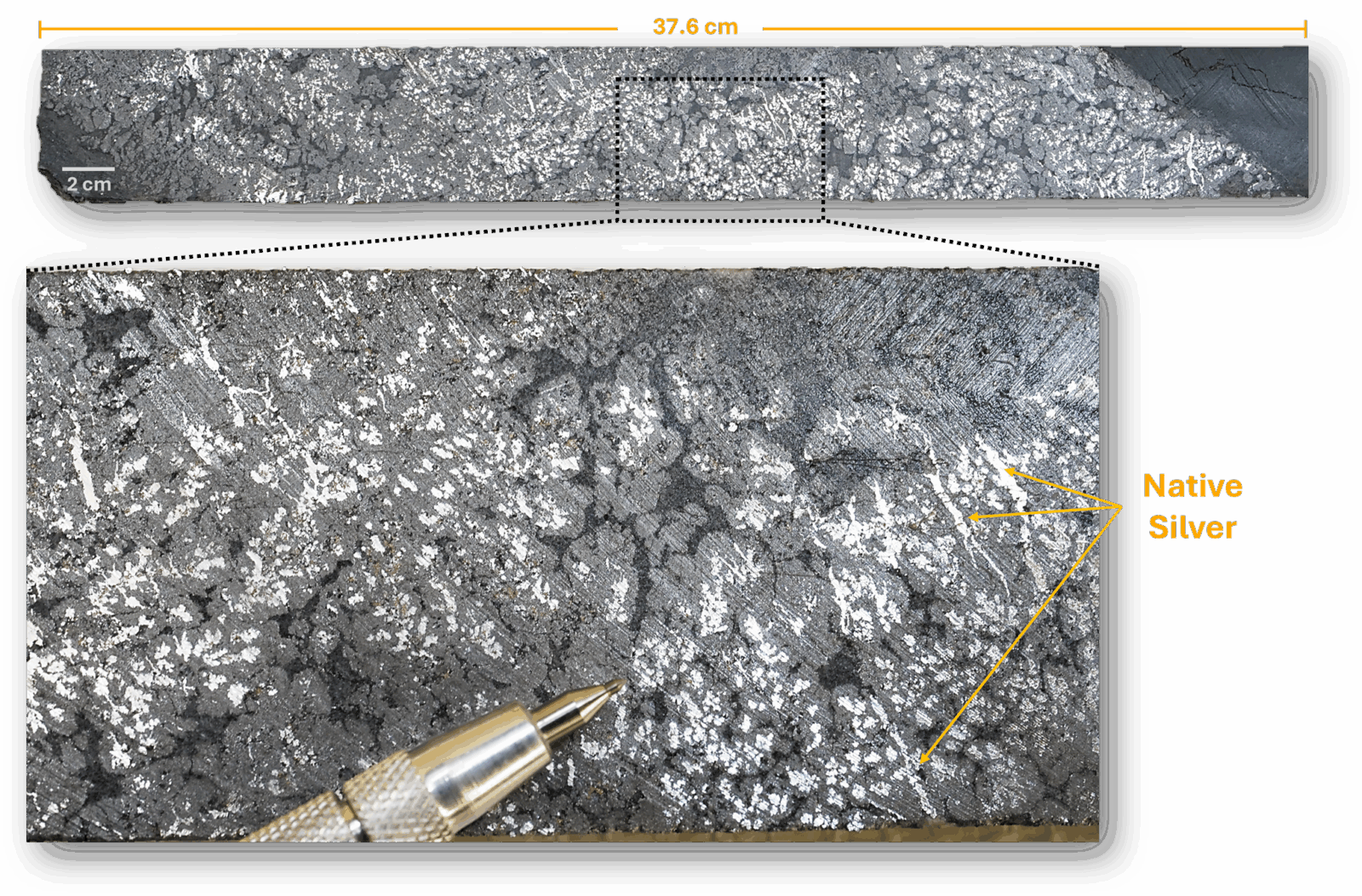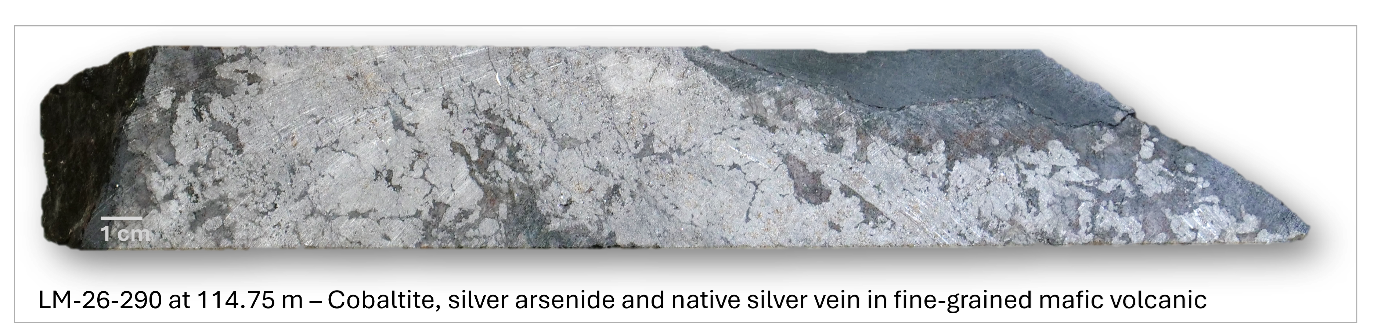 Figure 1. Core photographs of hole LM-26-290 from 115.25m, displaying native silver (appearing white) and cobaltite.