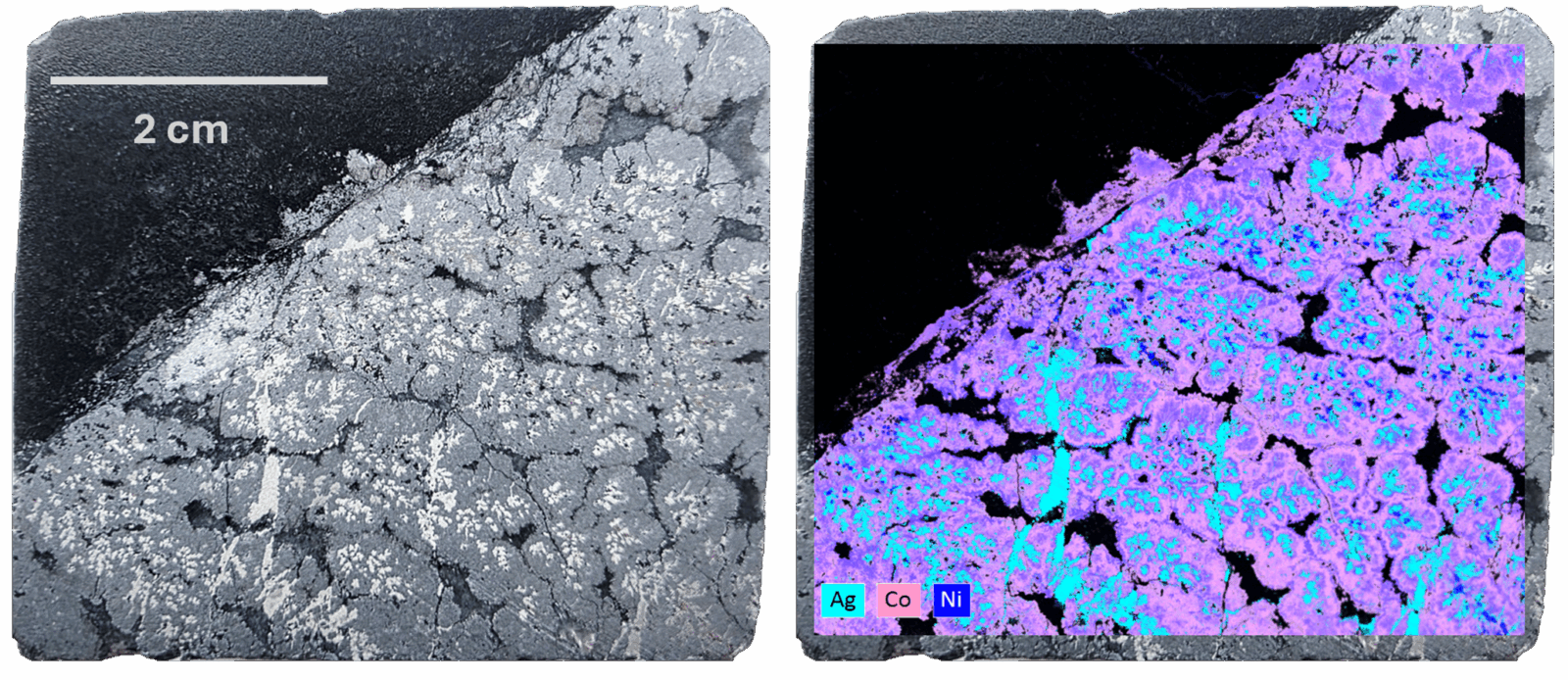 Figure 2. Core Photograph (left) and micro-XRF map (right) of a 5cm wide piece of vein and wall rock from h ole LM-26-290 at 115.65m. Note the distribution of Silver (Ag) within Cobalt (Co) and Nickel (Ni) spheroids.