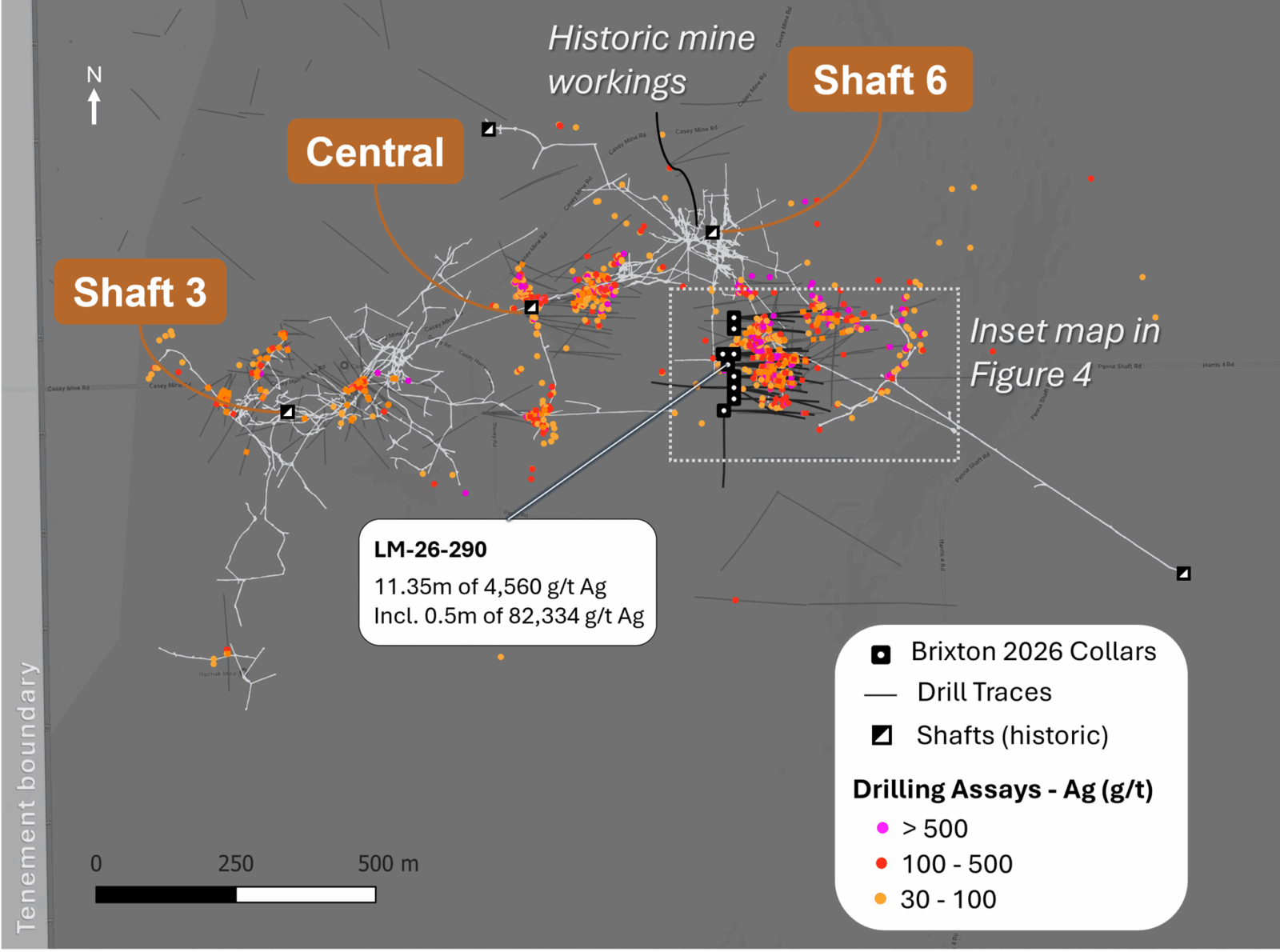 The initial drill holes of the 2026 program were designed to evaluate silver mineralization south of the Shaft 6 area (Figures 3 and 4). Previous exploration campaigns in this area identified silver mineralization predominantly hosted within vertical, dilatant zones and shear‑related veins, typically occurring as centimetre‑sc ale native silver veinlets, disseminations, rosettes and fracture infill. Several holes reported herein successfully intercepted silver mineralization (Table 1).