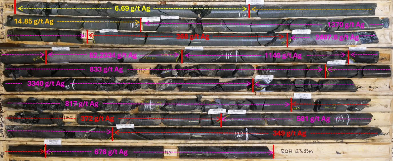 Figure 7. Core box photographs of hole LM-26-290 from 111.0 m to the end of hole (EOH) at 123.35 m, including silver assay results.