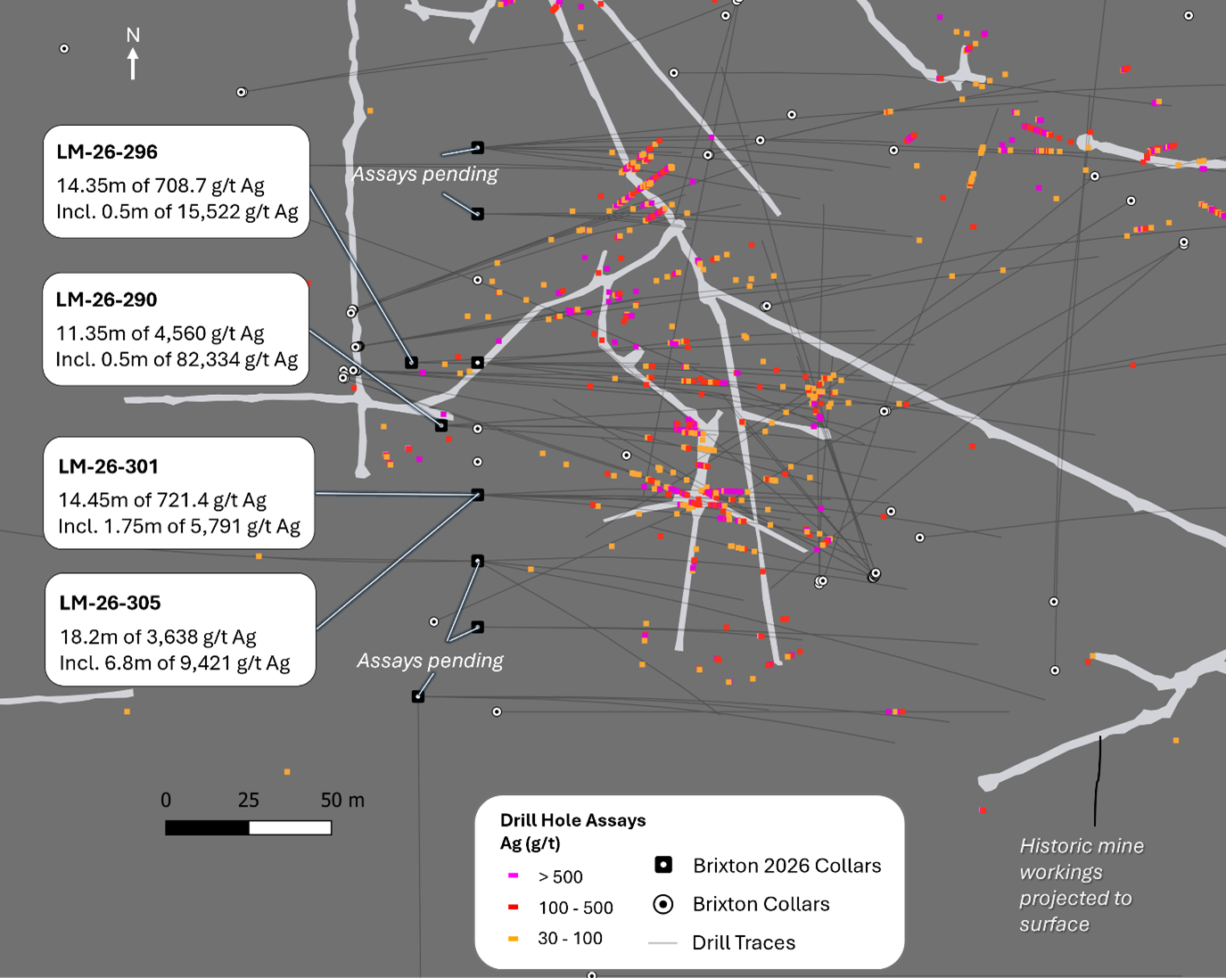 Brixton Metals Corporation (TSX-V: BBB) (OTCQX: BBBXF) is pleased to announce the third batch of results from its ongoing exploration at the wholly owned Langis Silver Project, located in the historic silver mining camp of Cobalt, Ontario, Canada. The 2026 drill campaign marks a significant milestone, targeting both infill and expansion of established high-grade silver zones. To date, a total of 8,282 metres across 43 drill holes has been completed in 2026 (Figure 8). This includes 9 holes previously reported (refer to News Release, March 10, 2026), 5 holes previously released (refer to News Release, March 18, 2026) and 4 holes for 649.80m reported herein.