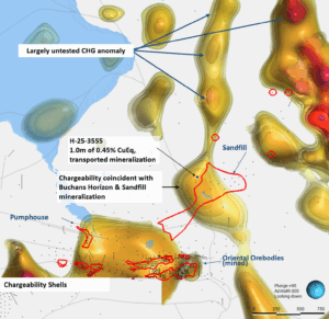 • Sandfill: Hole H-25-3555 intersected 1.0 m grading 0.45% CuEq, mineralization coincident with a large, 1.5 km-long chargeability anomaly and associated alteration footprint, including a broad zone of Na₂O depletion that appears to broaden to ~200 m thickness in adjacent historical drill holes, a key VMS pathfinder. The majority of this 1.5 km anomaly remains untested and is a high-priority target for 2026 drilling.