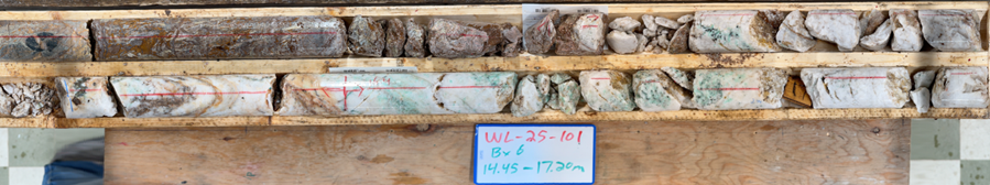 Results from WL-25-100 and WL-25-101 provide additional support for continuity of the Elm Zone vein system, as gold grades are consistently elevated where quartz-sulphide vein material and associated alteration are present. Together, these holes demonstrate repeatability of mineralization style and grade association within the Elm corridor and will be used to refine targeting for follow-up drilling.