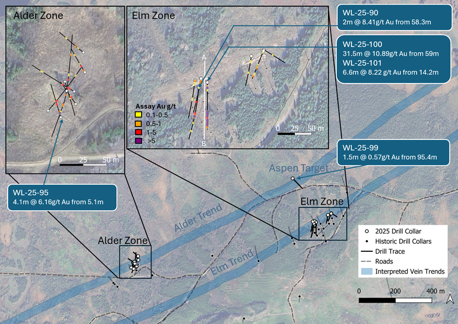 Hole WL-25-100 was designed to test the extensional veins in the immediate hanging wall of the known Elm vein system; however, the hole intersected the vein. The 31.5 m downhole interval (10.89 g/t Au) is interpreted to represent a low-angle intersection of the Elm vein system, which can result in an apparent thickness significantly greater than true vein width. True widths will be refined with additional drilling and structural measurements.