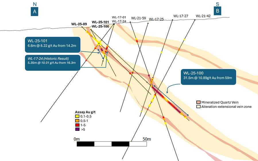 *All reported intervals are downhole lengths. True widths have not yet been determined. Based on current structural interpretations, mineralized intervals in holes WL-25-90, WL-25-100, and WL-25-101 are interpreted to represent shallow-angle intersections of quartz-sulphide veins. As a result, reported downhole lengths may be significantly greater than true vein widths, however, additional drilling is required to make an accurate interpretation of true widths.