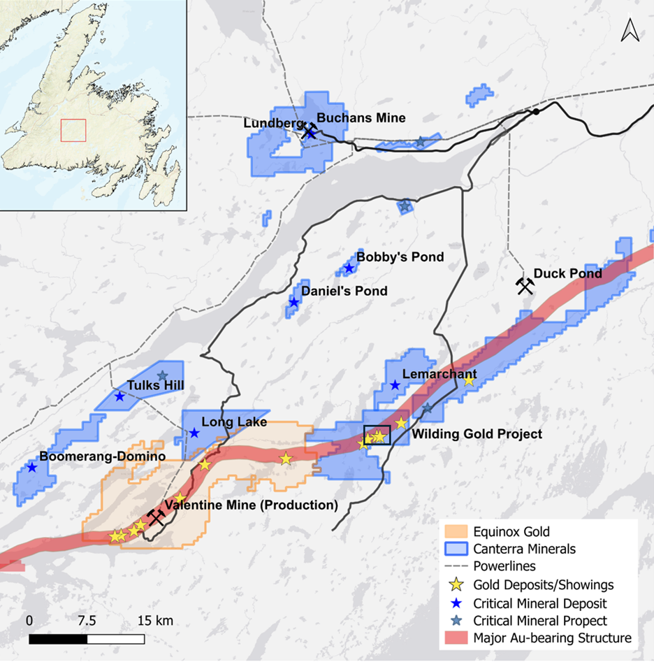 Canterra is a diversified minerals exploration company focused on critical minerals and gold in central Newfoundland. The Company’s projects include six mineral deposits located in close proximity to the world-renowned, past producing Buchans Mine and Teck Resources’ Duck Pond Mine, which collectively produced copper, zinc, lead, silver and gold. Several of Canterra’s deposits support current and historical Mineral Resource Estimates prepared in accordance with National Instrument 43-101 and the Canadian Institute of Mining, Metallurgy, and Petroleum Definition Standards for Mineral Resources and Mineral Reserves. Canterra’s gold projects are located on-trend of Equinox Gold’s producing Valentine Mine and cover a ~55 km extension of the same interpreted structural corridor that hosts mineralization within Equinox Gold’s mine project. Drilling within the Wilding gold projects intersected multiple occurrences of orogenic-style gold mineralization within a large land position that remains underexplored.