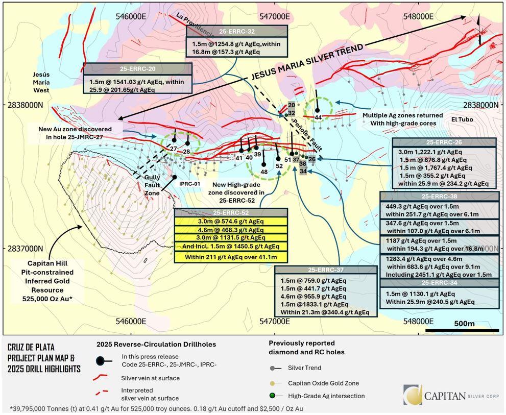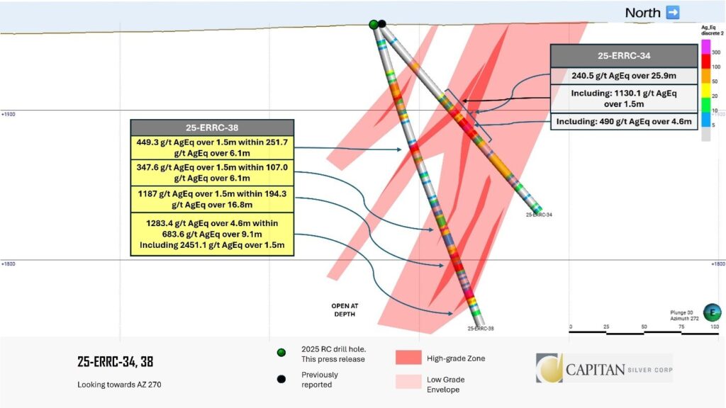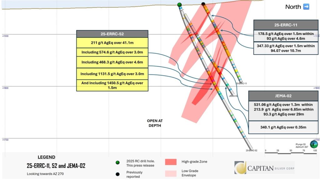 Drill hole 25-ERRC-52 (see Figure 2) was collared at the same location as previously reported drill hole JEMA-02 which was drilled by its previous owner, Minera Fresnillo S. A. de C. V. (a wholly owned subsidiary of Fresnillo plc) and was subsequently acquired by Capitan in 2022 (see Capitan news release dated December 6, 2022). Previously reported drill hole JEMA-02 intersected 531 g/t AgEq over 1.3m within 214 g/t AgEq over 6.85m, within a wider zone of 93 g/t AgEq over 29m.