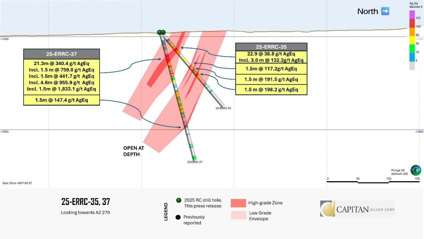 The Company continues to build confidence in the continuity of the 3.7km silver trend. Drill hole 25-ERRC-37 intersected multiple high-grade zones below drill hole 25-JMRC-35, extending mineralization down-dip ranging from 20m to 80m. This high-grade shoot has now been drilled over a strike length of approximately 140m east-west by 220m down-dip and remains open at depth.