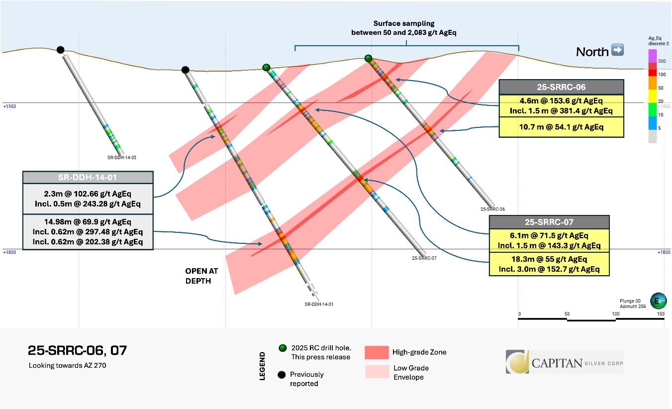 Additional widely-spaced, shallow drilling at new targets and expansion zones continue to return >100 g/t AgEq intervals, confirming that broad zones of mineralization contain higher-grade cores. Drilling along the eastern portion of the main 3.7 km Jesus Maria Silver Trend continues to return multiple sub-parallel zones of silver mineralization that exhibits strong continuity both along strike and down-dip. Drill holes 25-SRRC-05, 06 and 07 were designed as a fence to test an area of mineralization that returned silver grades between 50 and 2,083 g/t AgEq from surface sampling (see Figure 4). Results show that silver mineralization in this area is widespread, with best results returned including 381.4 g/t AgEq over 1.5m in drill hole 25-SRRC-06 and 152.68 g/t AgEq over 3.0m from drill hole 25-SRRC-07. Drilling at San Rafael is still at an early stage, with follow up drilling planned to be at tighter spacing as well as step-outs at depth, to define the orientation and controls on higher-grade zones.