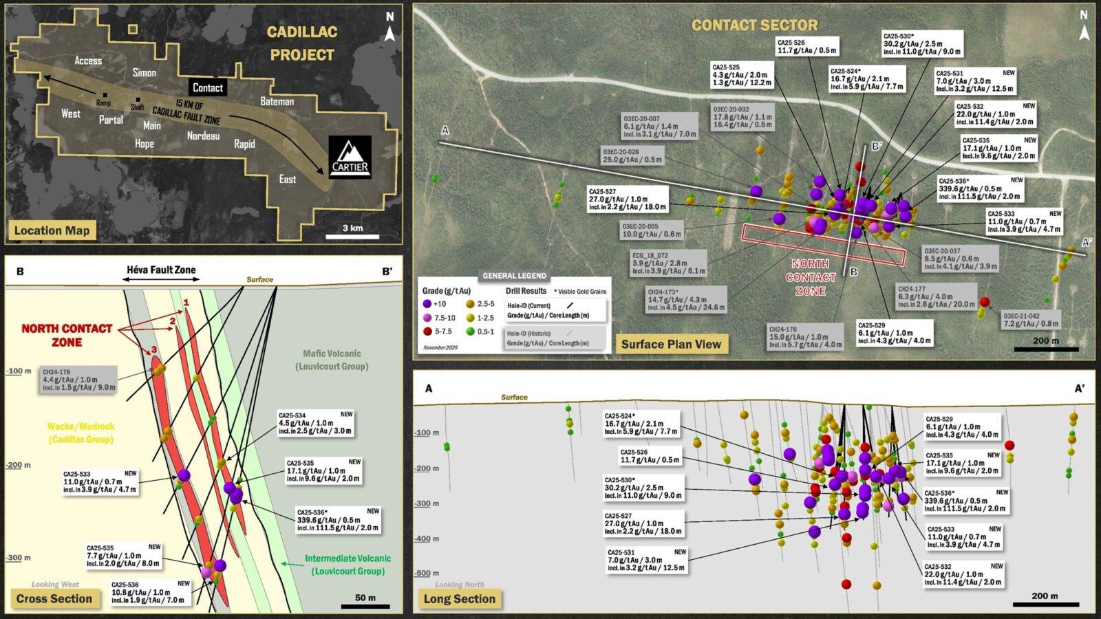 Cartier Resources Inc. (TSX-V: ECR) (FSE: 6CA) is pleased to announce the fourth batch of results from the fully funded 100,000-m drilling program (2 drill rigs) for the Contact Sector and more precisely, the North Contact Zone, on its 100%-owned Cadillac Project, located in Val-d’Or (Abitibi, Quebec). The NCZ consists of three parallel high-grade gold zones: NCZ1, NCZ2 and NCZ3, spaced approximately 50 m apart.