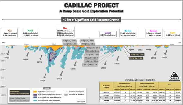 The Cadillac property contains total gold resource of 767,800 ounces in the measured and indicated category (10.0 Mt at 2.4 g/t Au) and 2,416,900 ounces in the inferred category (35.2 Mt at 2.1 g/t Au) across all the sectors. Please see the ″ NI 43-101 Technical Report and Mineral Resource Estimate on the Cadillac Project, Val-d’Or, Abitibi, Quebec, Canada. Pierre-Luc Richard, P.Geo. of PLR Resources Inc., Stephen Coates, P.Eng. of Evomine Consulting Inc. and Florent Baril, P.Eng. of Bumigeme Inc. ″, effective January 27, 2026.