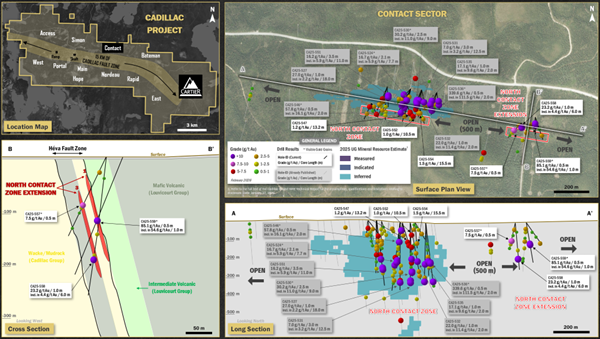 • Holes CA25-557, 558 and 559 discovered high-grade gold zones 500 metres along eastern strike extension of the NC1 and NC3 gold zones, significantly expands the North Contact main mineralized system. These new results, consistently associated with visible gold grains and sulphides, demonstrate the gold-fertile and robust geological continuity of the Contact Sector.