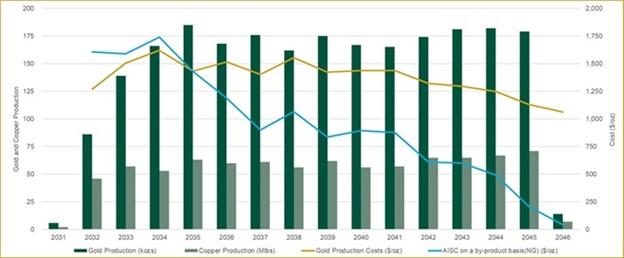 Kemess is a gold-copper porphyry deposit, and the PEA outlines a development approach in which conventional truck-shovel open pit mining begins first, followed by the start of longhole open stoping underground operations approximately two years later. Once underground production commences, both mining methods operate concurrently for the remainder of the 15 year mine life. Average annual production is expected to be 171,000 ounces of gold and 61 million pounds of copper (approximately 267,000 gold equivalent ounces assuming $3,000 per ounce gold, $4.50 per pound copper and $37.50 per ounce silver), at an AISC on a by-product basisNG of $971 per ounce. This integrated mine plan helps streamline the project execution, optimize plant feed and utilize existing infrastructure, while maintaining the expected timeline to first production in late 2031. Key critical-path items include the required BC Hydro sub-station upgrade, as well as permitting activities.