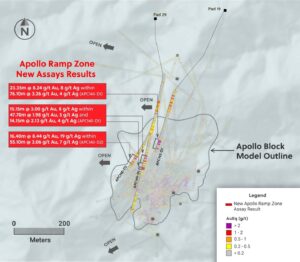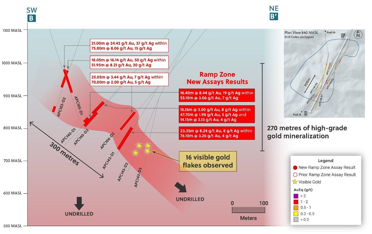 Ari Sussman, Executive Chairman commented: “These latest drill results continue to highlight the Ramp Zone’s impressive scale and high-grade potential. Hole APC143-D1, our deepest intercept to date in this area, not only extends the zone along strike and at depth but also demonstrates consistent mineralization over substantial widths. With additional rigs now on site and more assays pending (including two holes with significant visible gold flakes logged), we’re excited to accelerate our exploration efforts and unlock further value at Apollo.”